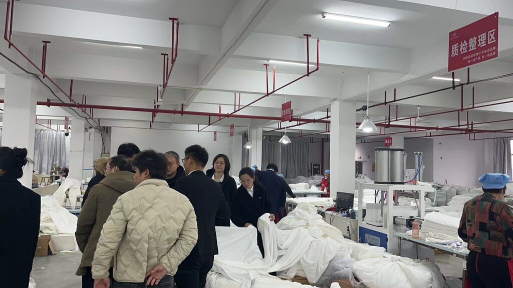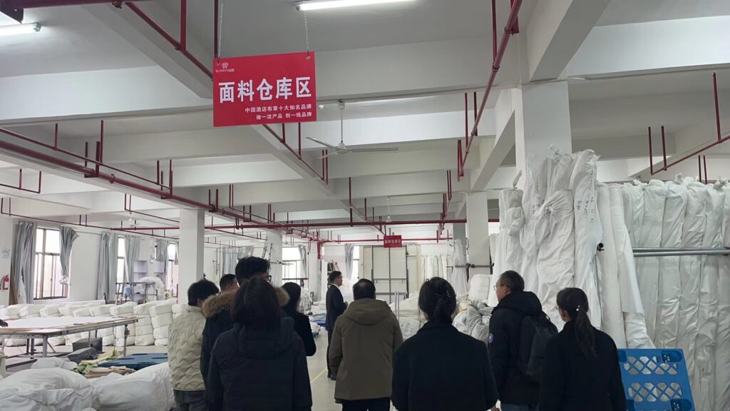在瑞棉工作人员的带领下,杭州文澜大酒店团队参观了现代化、高效率的生产车间。车间内分区明确,设有面料仓库区、质检整理区、枕芯区、成品区等。先进的自动化生产设备有序运作,工作人员熟练地操作着机器,整个生产流程高效且规范。团队成员近距离观察了酒店套件、巾类、浴袍等产品的生产过程,对瑞棉的生产工艺和产品质量有了更直观的认识。