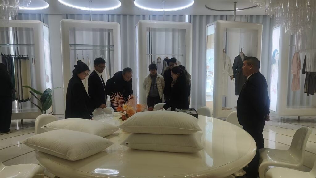 在会议室,瑞棉的相关负责人通过PPT演示和详细讲解,向来访团队介绍了公司的发展历程、技术研发实力以及未来的发展规划。瑞棉拥有专业的设计研发团队,6名设计师不断推陈出新,紧跟市场潮流和客户需求,开发出多款独具特色的酒店布草产品。公司具备完善的质量管控体系,10余名专业质检人员从每道工序到每件产品都严格把关,生产过程严格执行国家质检标准,确保产品的良品率高达99%。